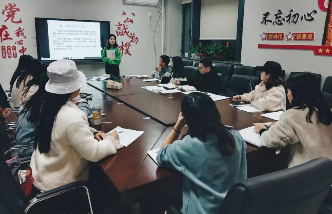 首先,由张宇帆同志带领大家学习了《普通高等学校学生党建工作标准》和《中国共产党发展党员工作细则》两个文件,强调学生党务工作的严谨性和重要性,并结合《发展党员工作流程图》,特别强调发展学生党员工作要坚持“三必须”原则:流程必须规范化,考核审查必须严格,手续材料必须齐全。我们要严格按照“三必须”的原则,结合具体实际情况,处理学生党务工作,这对我院学生党务工作的顺利开展具有重要作用。其次,张宇帆同志结合幻灯片展示,带领大家更加细致精准地学习了入党程序、手续及其相关注意事项,并结合近期工作在实际操作中遇到的问题,提出了加强与改进意见。最后,其他与会同志提出所存疑惑,问题在交流中得以解决。