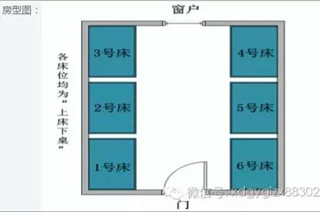 每个宿舍都是3和4号床靠窗,1和6号床靠门,2和5床中间, 上床下桌。