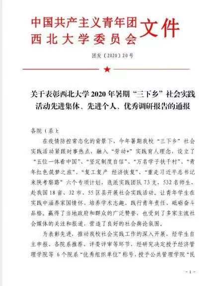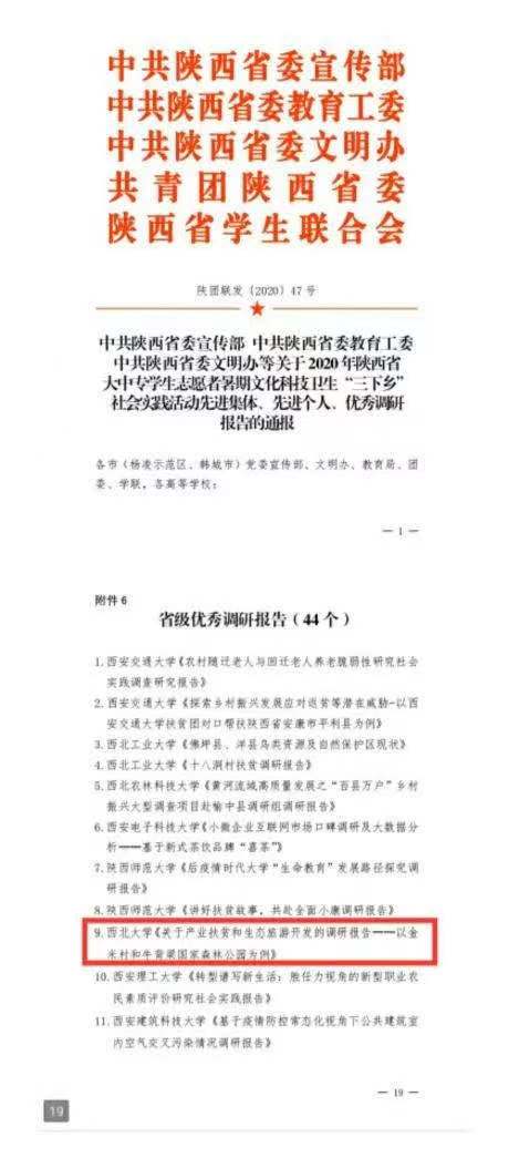 11月20日,根据《中共陕西省委宣传部 中共陕西省委教育工委 中共陕西省委文明办等关于2020年陕西省大中专学生志愿者暑期文化科技卫生“三下乡”社会实践活动先进集体、先进个人、优秀调研报告的通报》文件有关通知,我院“保护绿水青山,助力脱贫攻坚”实践队所撰写的调研报告获得“省级优秀调研报告”。