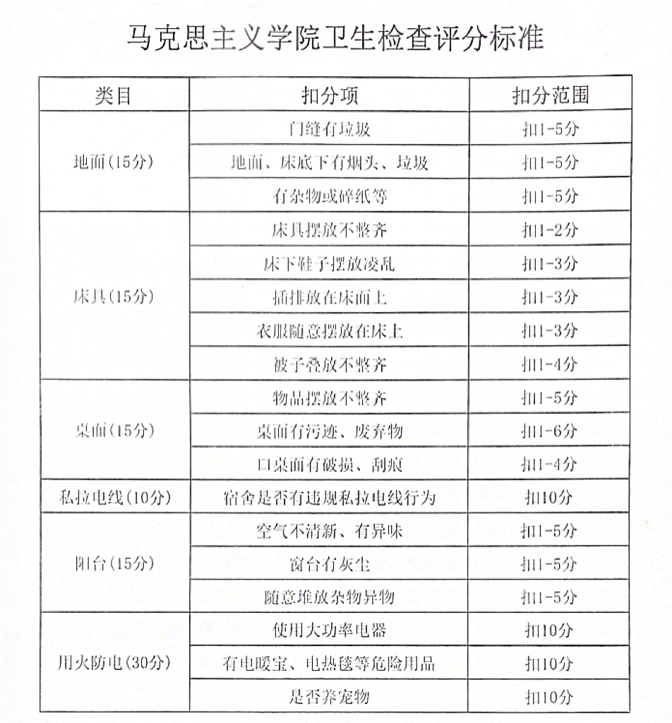 为培养我院青年学生的自立意识和良好健康的学习生活习惯,创建整洁文明、舒适优美的学习生活环境,结合学院学生公寓楼管理实际情况,6月28日到6月30日,马克思主义学院举行了“优秀宿舍”评比活动。评比工作由辅导员刘娟带队,学院研究生会和党务工作组组织开展。