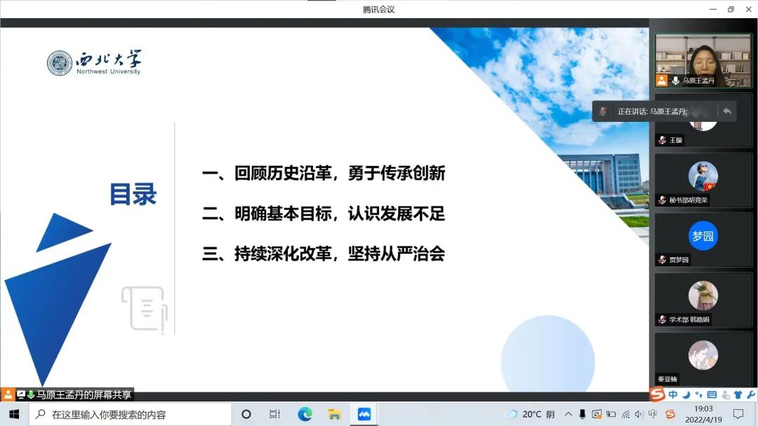 为引领教育研究生会成员胸怀崇高理想、恪守学生本分、牢记服务宗旨,按照省学联、校研究生院及校团委工作安排,2022年4月19日晚,我院研究生会主席团组织召开春季学期研究生会工作人员培训会和各部门工作述职大会。