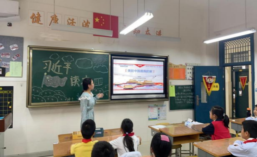 张依芳主讲的内容是《美丽中国是我的家》,她先播放了《大美中国》的视频,激发起小朋友们对我国党史国情的学习兴趣,又以讲故事的方式介绍了有关我国国旗、国徽、国歌的相关知识,让同学们开阔视野、增长见识,同时也让他们明白爱国不应停留在口号上,而要从生活中一点一滴的小事做起,用实际行动表达对祖国的热爱。
