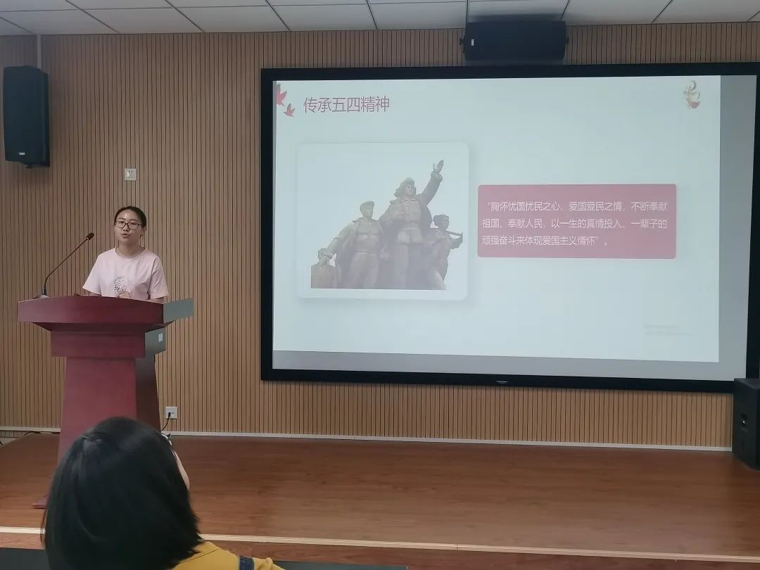 张依芳同学围绕传承五四精神、新时代需要青年勇于担当、疫情下青年担当和展望未来,砥砺前行四个方面对《青年的使命与担当》这一主题进行了讲述。她谈到,由青年学生组织的五四运动不仅彰显了他们在民族危难之际勇于担当的作为,更是他们满腔爱国情怀的浓厚表现。而一百年后的今天面临新机遇,新挑战,当代青年应在时代赋予的使命中,砥砺前行,展望未来,努力做到以下几点:第一,树立远大理想,勇担历史使命;第二,掌握专业知识,提升自身本领;第三,培养实践能力,磨练意志品质。