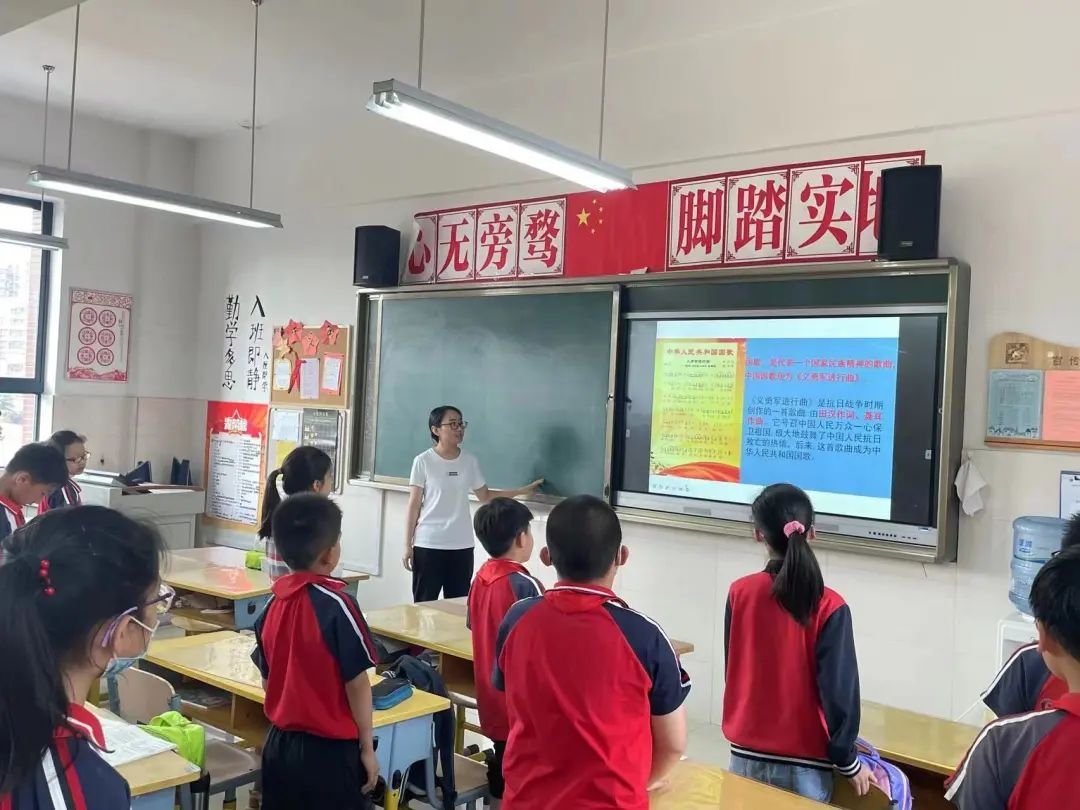 张依芳以《美丽中国是我的家》为主题,通过播放《美丽中国》自然风光的视频,使学生在领略祖国大好河山的过程中燃起对祖国的热爱之情与民族自信。在学习国徽、国旗、国歌的环节中,同学们认识到爱国绝不能停留在口号上,而是要把自己的理想同祖国的前途、把自己的命运同民族命运紧密联系在一起,奉献青春,绽放光彩。