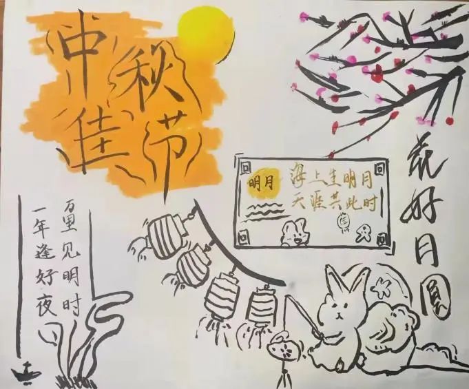 “定知玉兔非常圆,化作双风九月寒。”中秋节怎么少得了可爱的玉兔呢?同学们笔下的玉兔活灵活现,在这个中秋佳节之际为我们送来暖暖的祝福。