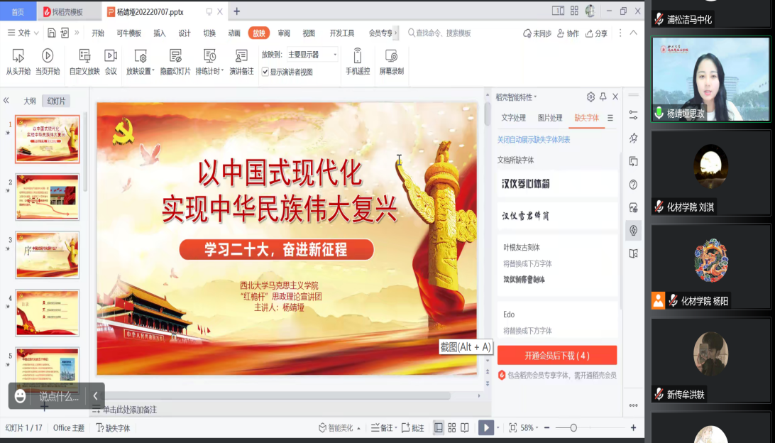 12月13日,马克思主义学院“红桅杆”思政理论学习社团在西北大学学生会开展了线上理论宣讲。本次活动的主讲人分别是22级思想政治教育专业的硕士研究生杨靖垭和22级马克思主义基本原理专业的硕士研究生罗欣媛。
