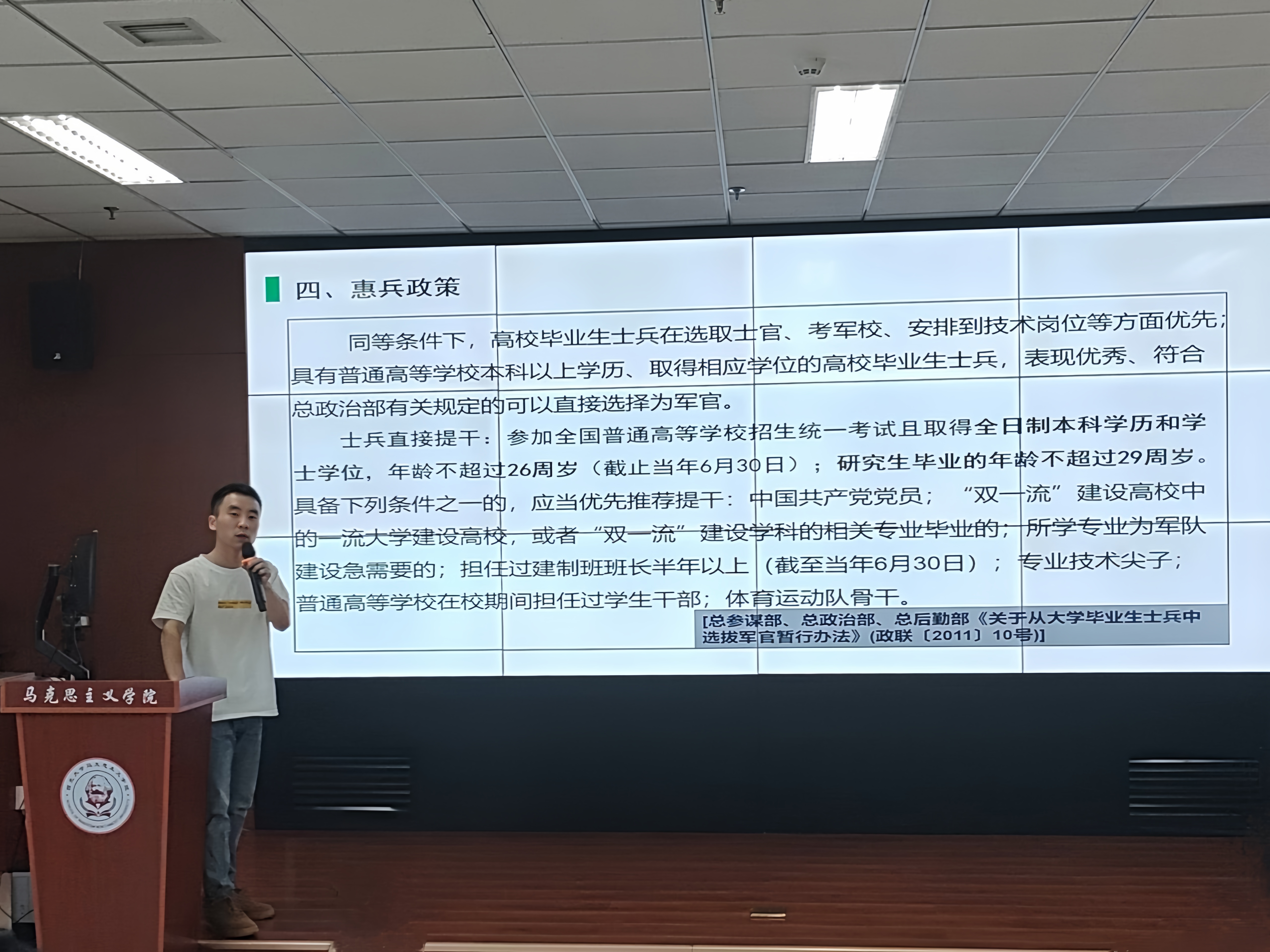 2023年6月13日下午,马克思主义学院开展“执笔为戈,筑梦军营”征兵政策宣讲会。宣讲会由我院退伍大学生士兵、2022级硕士研究生刘志晨主持。