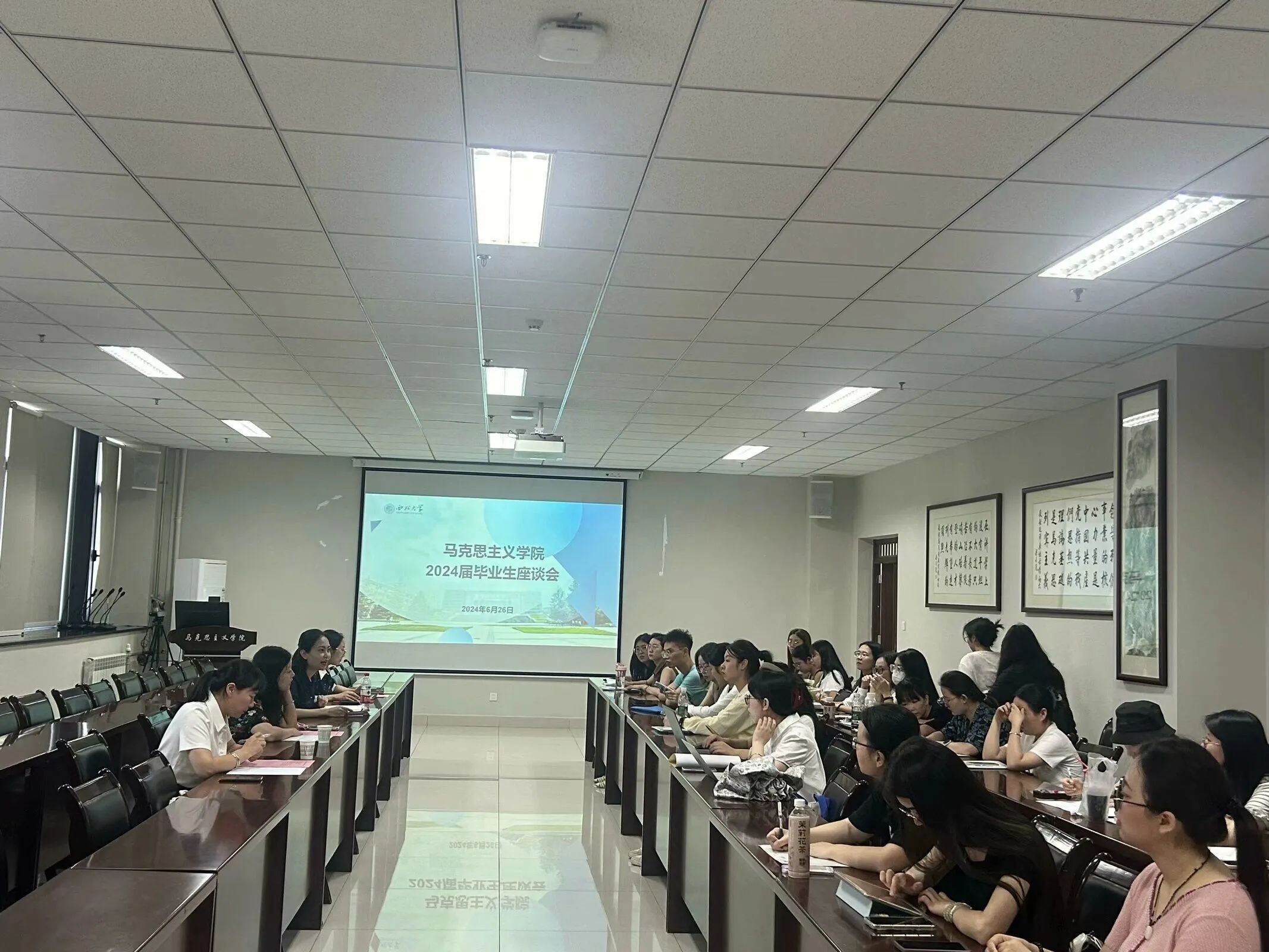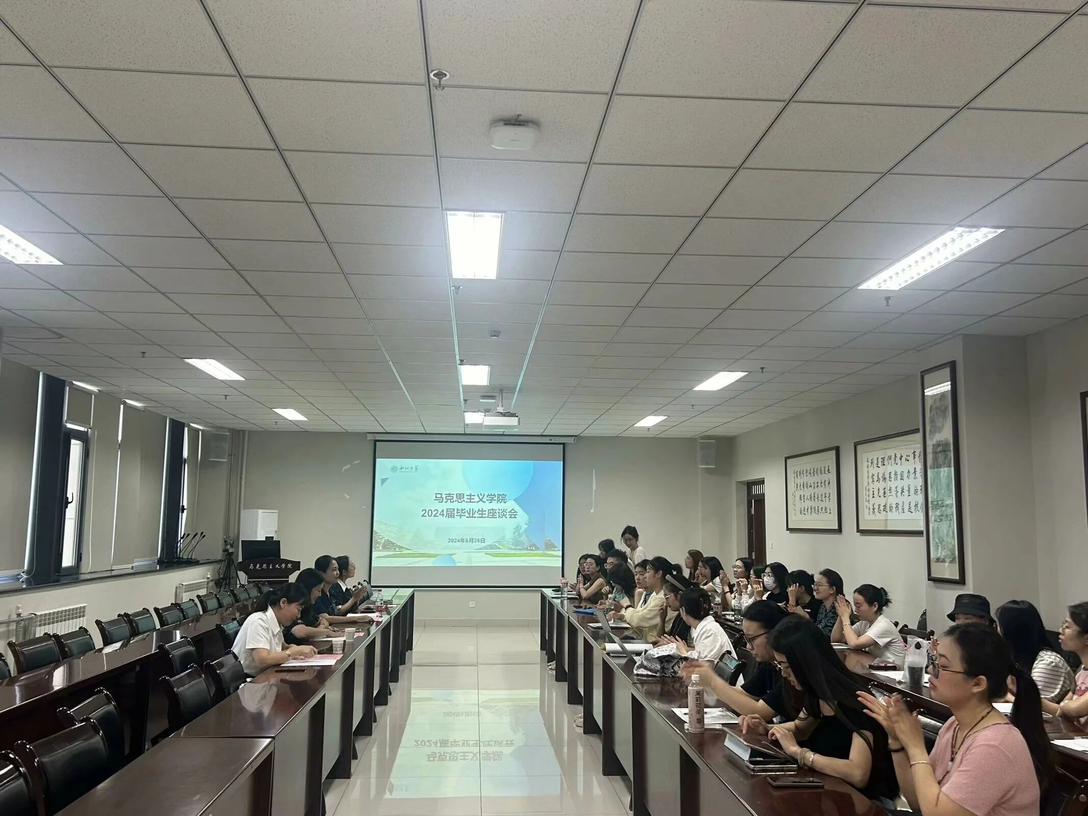 6月26日上午,我院于学院会议室举办2024届毕业生座谈会及离校教育。院党委副书记邵平,2021级马原专业班主任郭莹老师,2021级马中化、近代史专业班主任何金凤老师,辅导员刘娟,2024届全体毕业生参加座谈会。会议由我院党委副书记邵平主持。