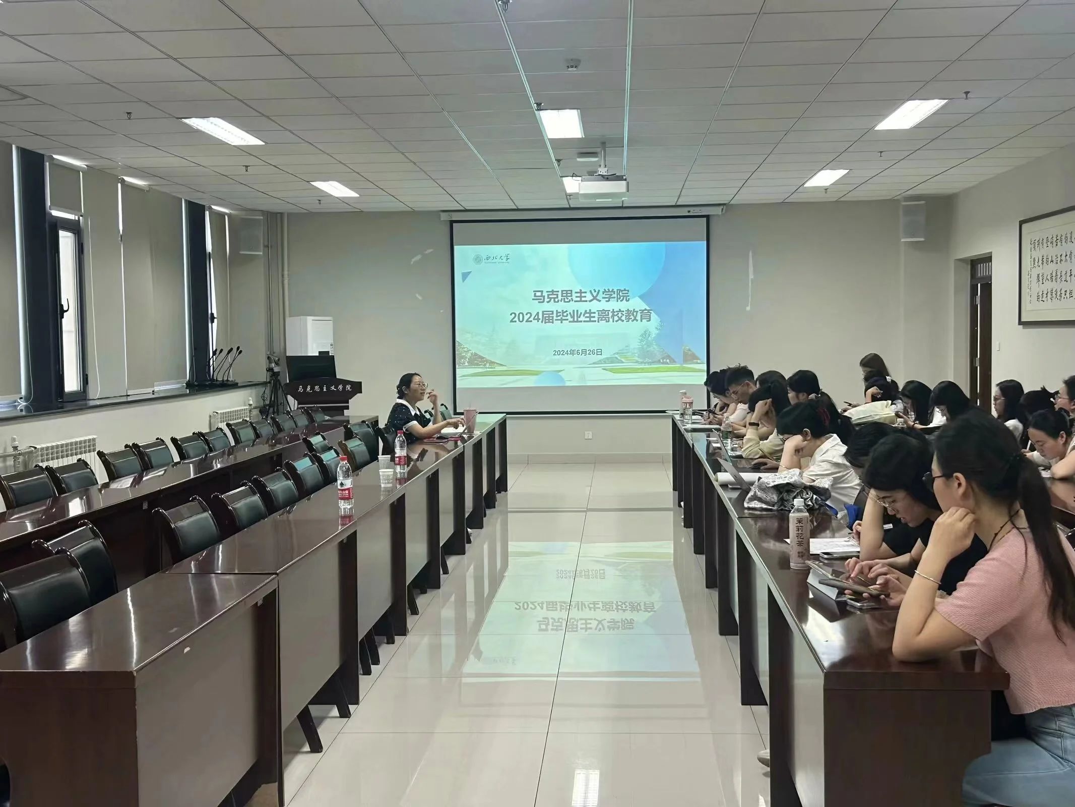 邵平对我院2024届毕业生进行了离校教育。她希望大家始终怀揣梦想、脚踏实地,时刻保持谦虚谨慎的态度,不断学习,提升自己,在面对工作、家庭、生活时充满耐心和信心,牢记西大马院人的身份,积极进取,为实现自己的人生目标而努力拼搏,做一名优秀的西大校友。同时,她谈到,在今后工作、生活中遇到困难时,希望大家能够保持乐观阳光的心态,也可以随时向导师、同门、舍友和同学们寻求帮助,西大马院永远是大家坚实的后盾。