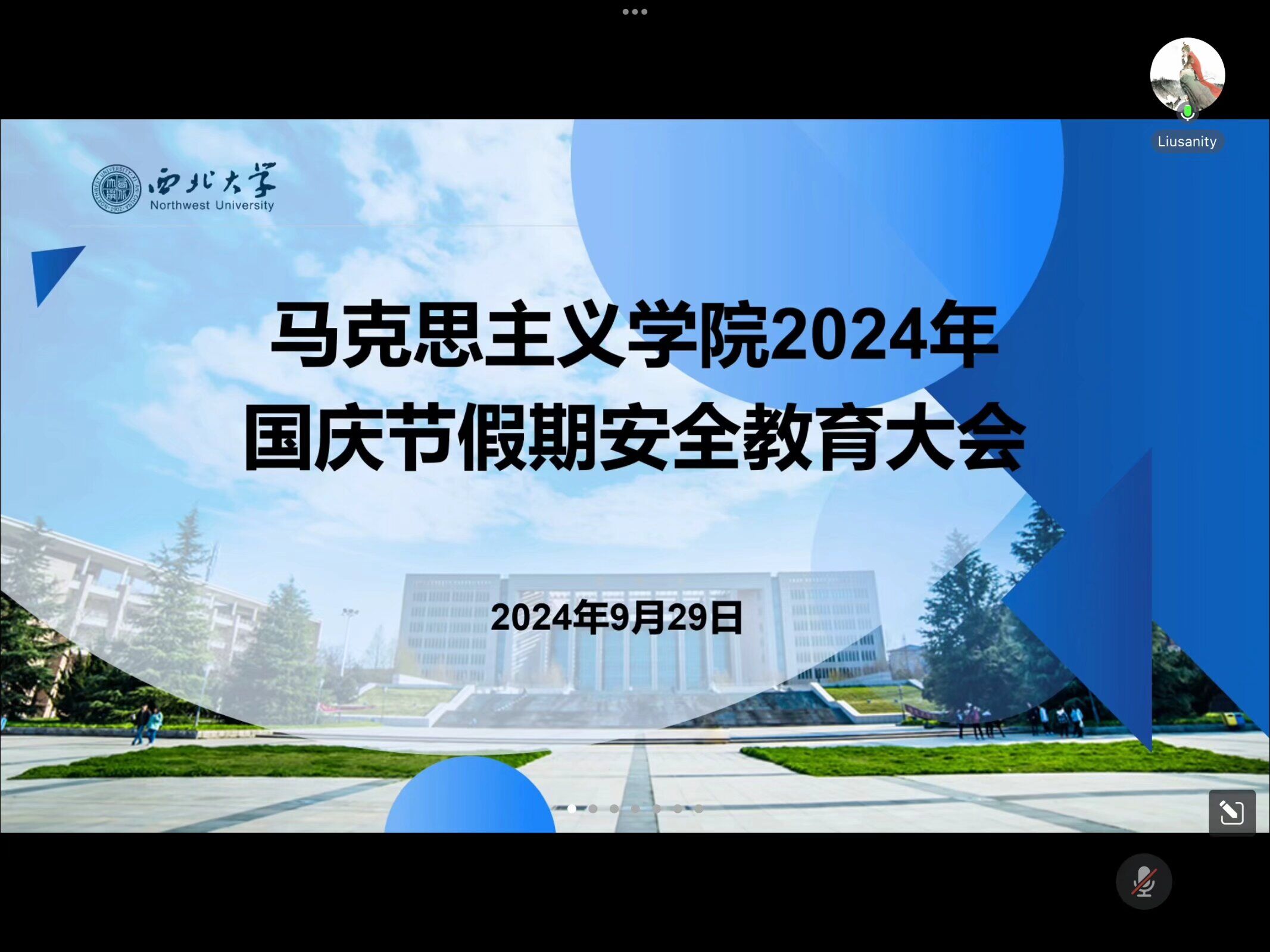 9月29日下午,我院召开2024年国庆节假期安全教育大会线上会议。我院全体研究生参与此次会议,会议由我院党务秘书刘通主持。