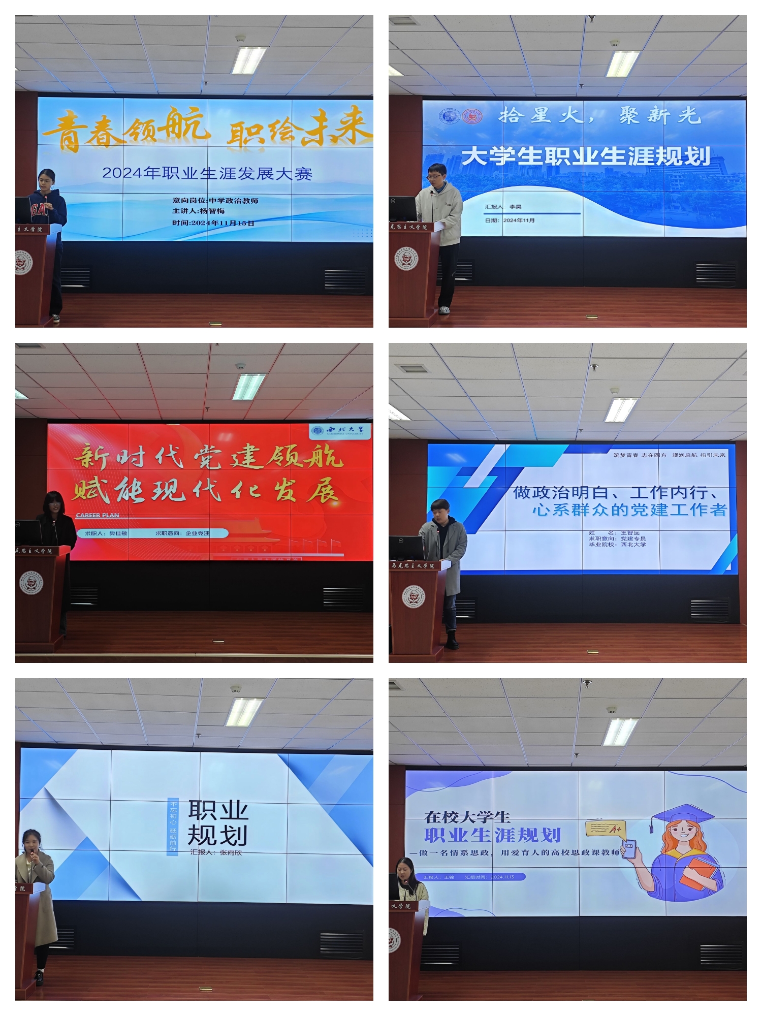 本次比赛将入围院级初赛的24名同学分为四组,每名参赛同学分别进行五分钟个人展示,汇报结束后由评委现场打分,最后由计分小组汇总。