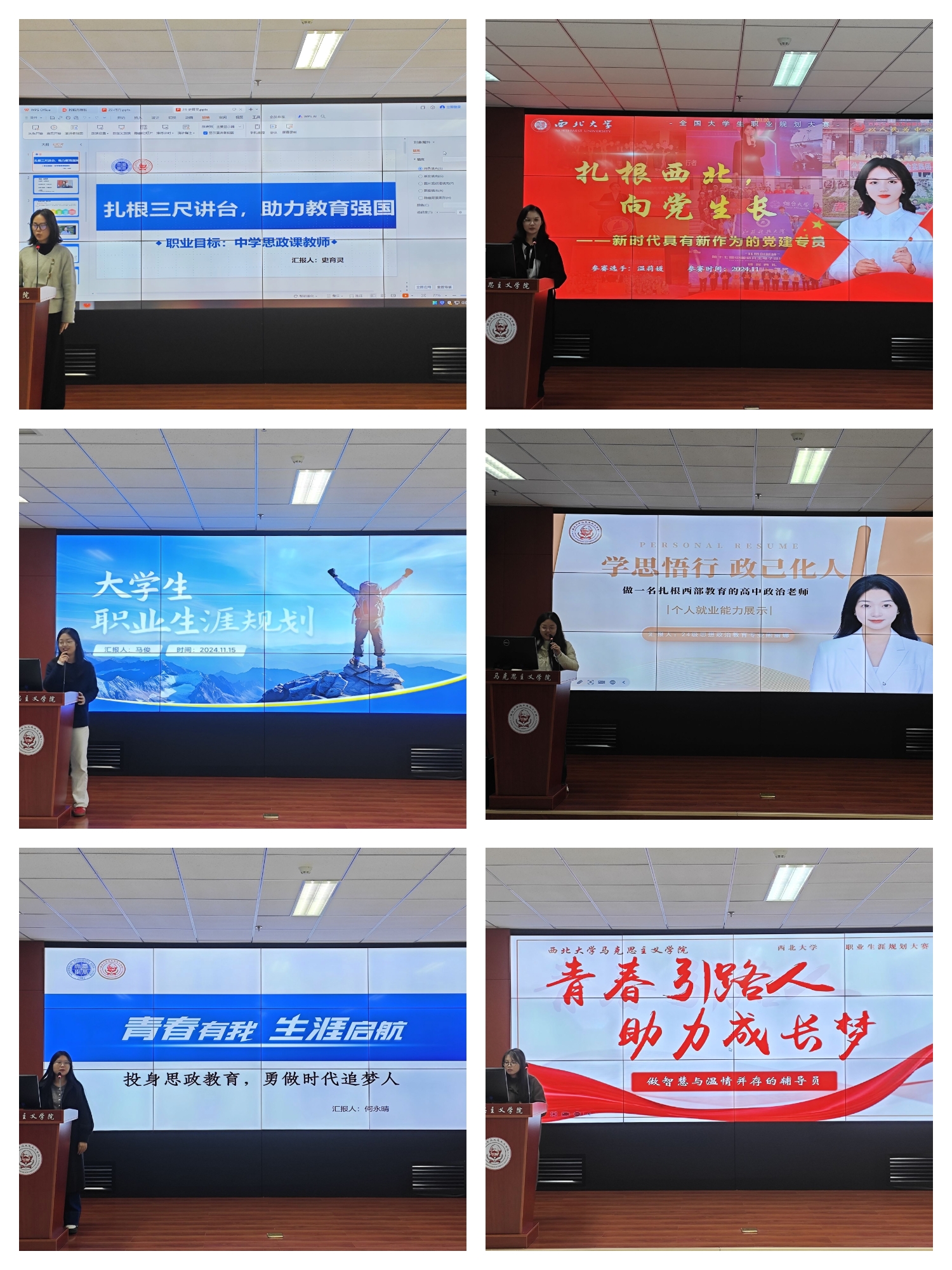 比赛过程中,各位参赛同学通过精彩的 PPT 展示、生动的演讲,向评委们依次阐述了自己的职业目标、自我认知、所获荣誉、实践经历以及职业规划等方面的内容。通过演讲,不仅充分展现了选手们自身扎实的专业知识,而且表明了自身正确的就业观、择业观以及面对未来就业不确定性的灵活应对策略。