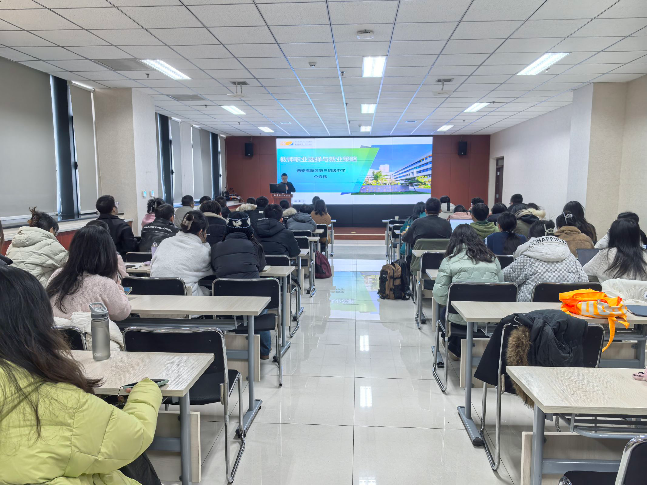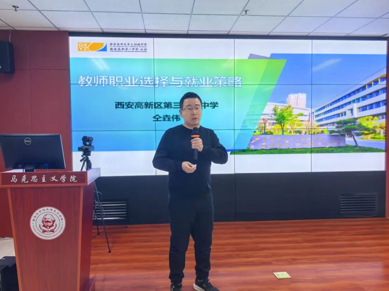 12月10日下午,西安高新区第三初级中学办公室主任,中学一级教师,西安高新区教学能手仝垚伟老师应邀为我院研究生在学院报告厅作《教师职业选择与就业策略》专题讲座。讲座由我院党委副书记邵平主持。