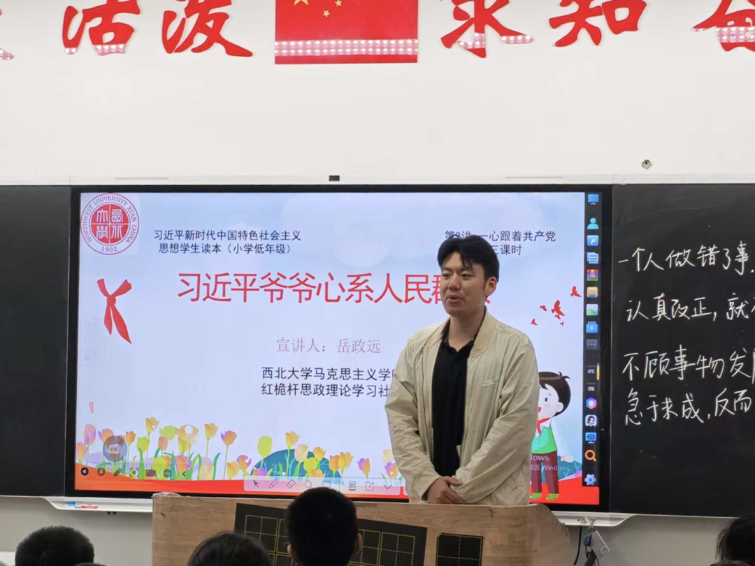 岳政远以《习近平爷爷心系人民群众》为题,用生动事例展现党与人民的深厚情谊,并引用习近平总书记的嘱托,引导同学们健康成长、立志成才。