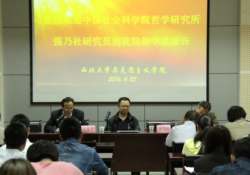 2016425日晚,由西北大学哲学与社会学学院主办的学术报告在5号楼一层会议室成功举行。中国社科院哲学所的强乃社研究员应邀为我院师生作题为当代马克思主义哲学视野中的都市社会的学术报告。本次报告由学院副院长王永智教授主持,哲学系系主任赵本义教授作点评。