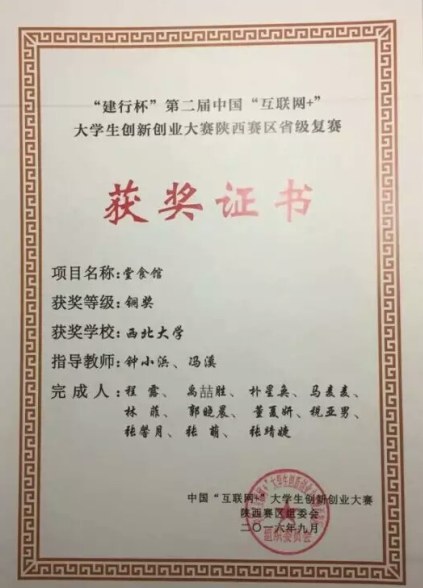近日,由我院社会工作专业学生程露等同学负责,钟小浜和冯溪老师指导的“堂食馆”项目在第二届“互联网+”大赛中获西北大学校级金奖、陕西赛区省级复赛铜奖,并受到学校表彰。