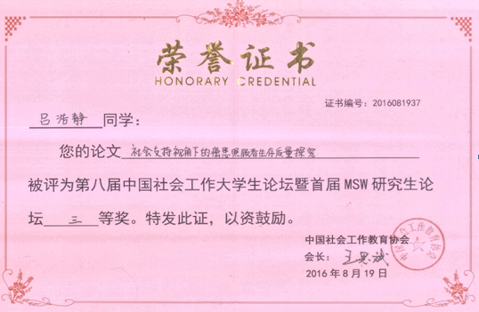 近日我院选派的两名社会工作专业学生参与第八届中国社会工作大学生论坛论文竞赛评选中,其中由钟小浜老师指导的吕浩静同学所撰写论文《社会支持视角下的癌患照顾者生存质量探究》获得大赛三等奖。
