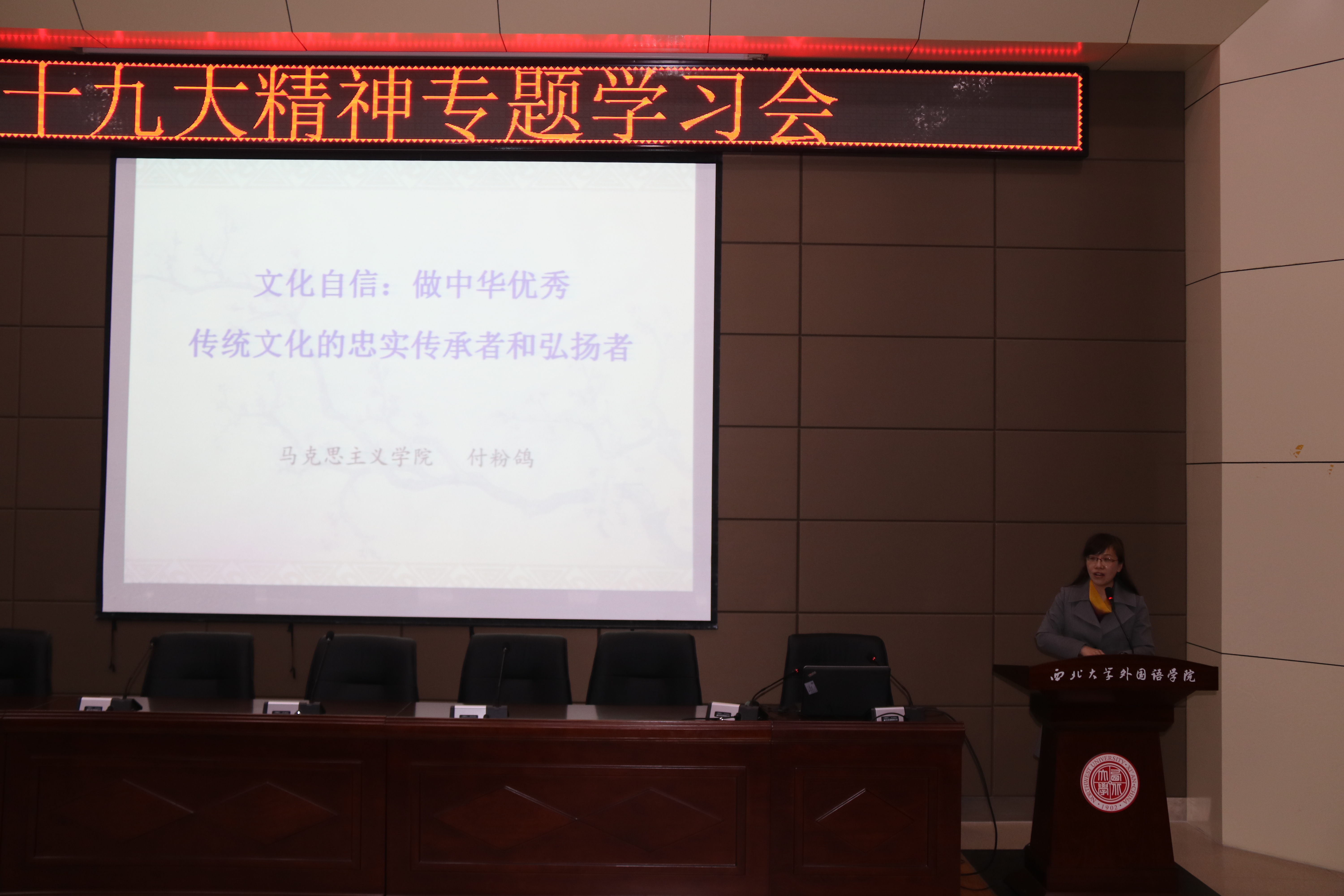 付粉鸽教授从十九大报告的“坚定文化自信、推动社会主义文化繁荣兴盛”这部分内容入手,以“做中华优秀传统文化的忠实传承者和弘扬者”的维度展开对文化自信的认识。认为中华传统文化历久弥新,不仅是中华民族精神的根,还是社会主义核心价值观的源,因此守源固根是建设文化强国的必由之路,为了返本开新,需要对传统文化要进行历史和理论的研究与阐发,用科学的态度实现传统文化的创造性转化与发展,最后以内化于心、外化于行的知行合一的态度,使传统文化具有无比强大的前进定力。