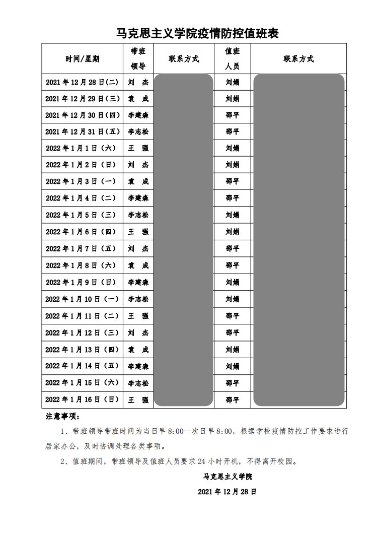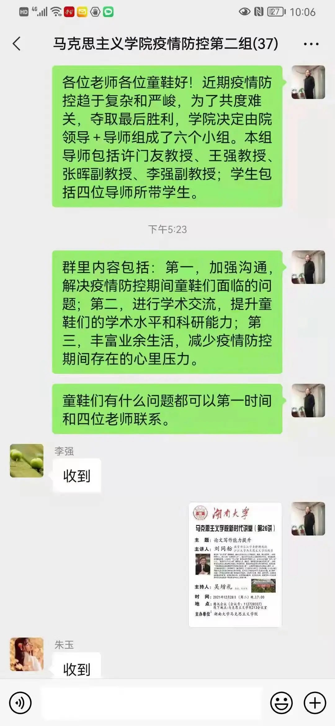 12月27日晚学校召开疫情防控工作学生管理专题会议后,马克思主义学院党政领导班子第一时间召开会议,根据学校要求研究制定本学院学生疫情防控管理工作机制。针对目前学生管理的挑战和压力,全体院领导和导师参与学生疫情防控管理,全力保障学生稳定安全,初步构建出1+3疫情防控管理模式。