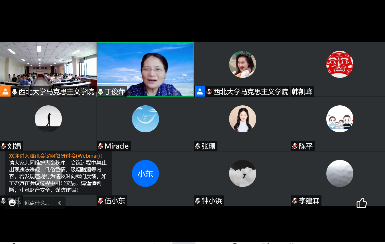 67上午武汉大学丁俊萍教授应邀做客我校“终南思政讲坛”,通过腾讯会议线上平台,作了题为民主革命时期马克思主义中国化主题的确立”的学术报告报告由马克思主义学院李志松副教授主持,马克思主义学院党委理论学习中心组成员及各党支部书记、2020级本科生代表、马克思主义学院师生共600余人通过线上线下共同聆听了本场报告。