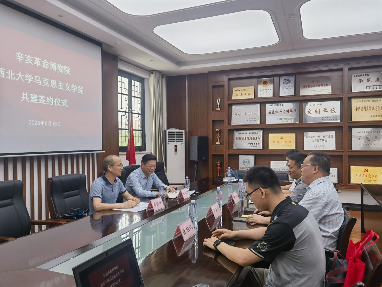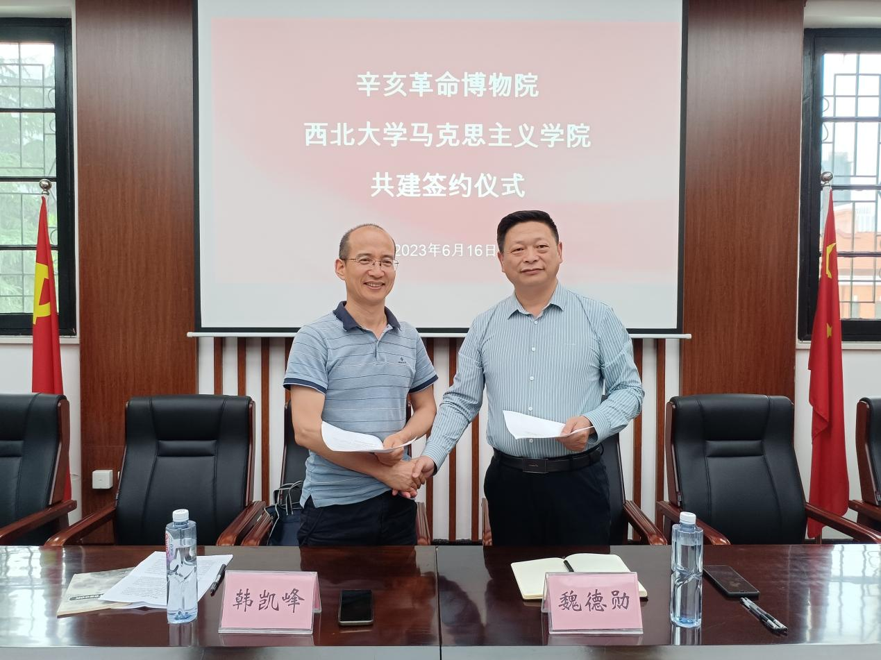 当日下午,我院在辛亥革命博物院开展交流合作。辛亥革命博物院院长魏德勋、副院长黄春华、办公室副主任黄玉霜、社会教育部主任鲁珊等参加座谈会。双方围绕思政课教学、人才培养、毕业生就业、革命文化传播、合作申报项目等进行了富有成效的交流。双方签订了共建协议,共建“大思政课”实践教学基地、研究生培养实践教学基地、文博行业人才培训基地、思政课教师培训基地等。