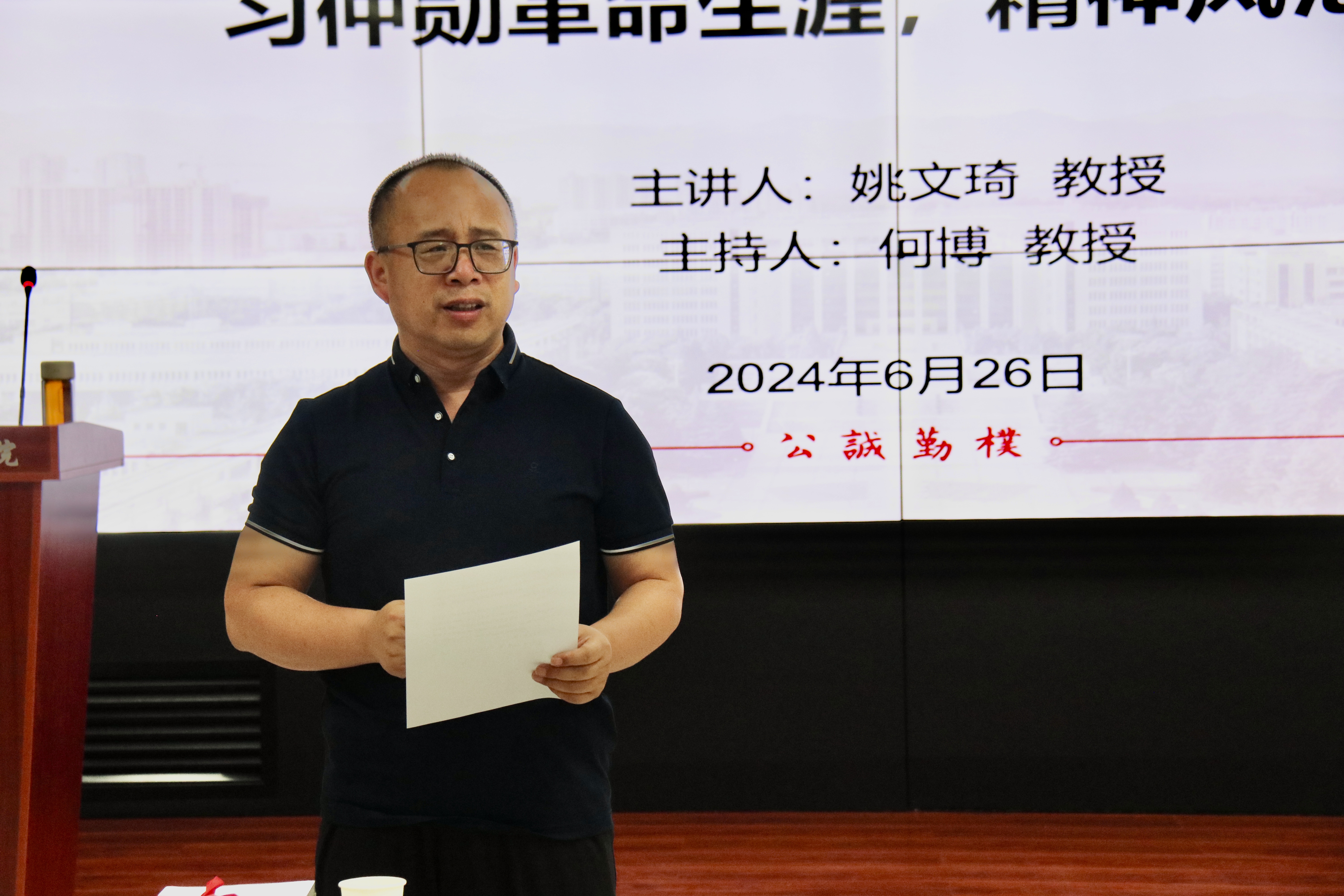 6月26日下午,中共陕西省委党史研究室原巡视员、陕西省中共党史研究会原会长、陕西省延安精神研究会副会长、西北大学特聘教授、国家出版基金专家组成员姚文琦教授应邀做客“终南思政讲坛”第35期,为我院师生作了题为《习仲勋革命生涯,精神风范与家风》的学术讲座。陕西省委党史研究室二级巡视员汤彦宜出席讲座。讲座由院长何博教授主持。