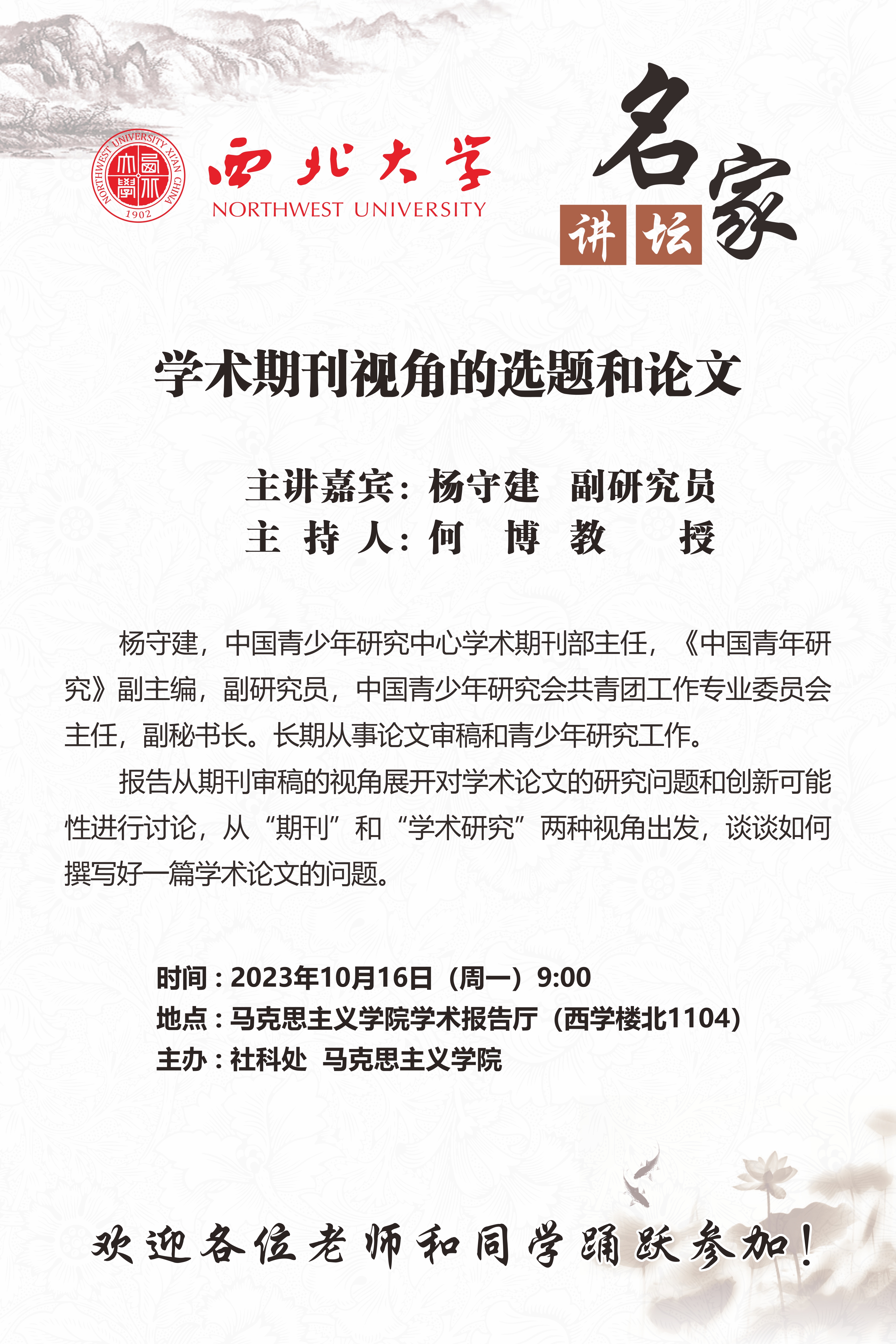 上一条:“侯外庐学术讲座”第三百零四讲——中共党史研究的若干思考 下一条:终南思政讲坛 第三十期 ——理论文章的选题与写作